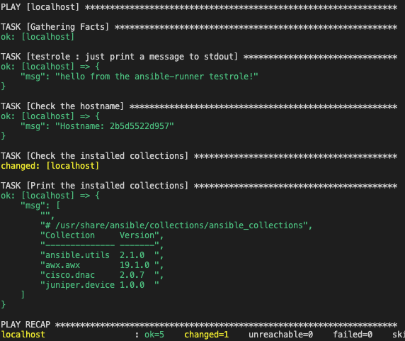 The playbook includes the testrole and a debug task that prints the hostname of the localhost to stdout and the installed collections. Lets run the playbook and verify the execution was successful in the container.