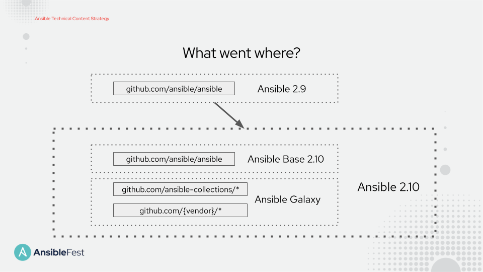 Prior to version 2.10 every module and plugin was part of Ansible itself. This created scalability issues with the number of new modules constantly being added. A more “sane” model was in urgent need. With the release of version 2.10 modules and plugins were migrated to collections which are no longer part of the Ansible base package installation. With this model you only have to install the modules and plugins that you actually use. Name change in ansible 4.0.0 onwards ansible-base to ansible-core, just to make it a little bit harder.