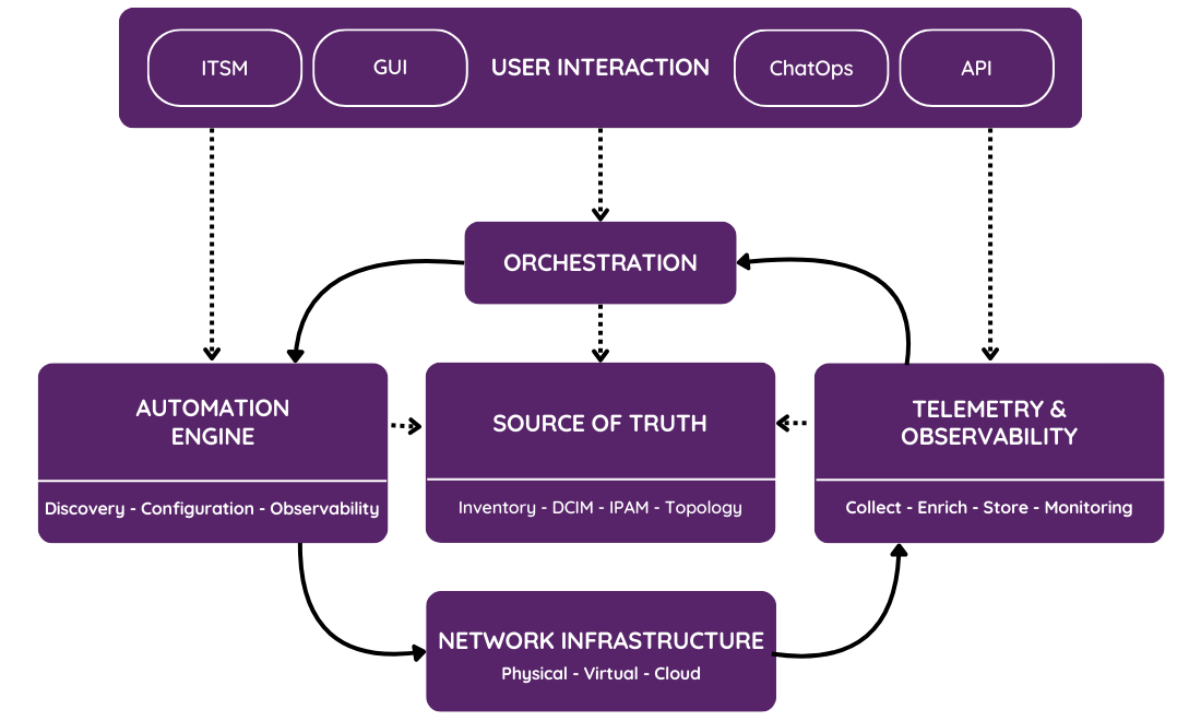 Nyckeln till framgång ligger i att förstå strukturen bakom en robust automationslösning. Vi har utvecklat en arkitektur indelad i sex distinkta block, var och en med specifika mål och funktioner. Genom att kartlägga arbetsflöden i dessa block och välja rätt verktyg för varje del, skapas en tydlig och effektiv väg mot automation. Denna modulära uppbyggnad är flexibel; det är fullt möjligt att anpassa eller hoppa över vissa block beroende på specifika behov. Vår arkitektur är mer än ett ramverk – det är en guide till effektivare nätverksoperationer.